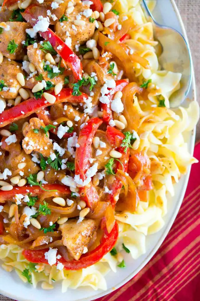 - Serve chicken paprikash over egg noodles. Garnish with pine nuts, crumbled feta cheese and parsley. Enjoy!