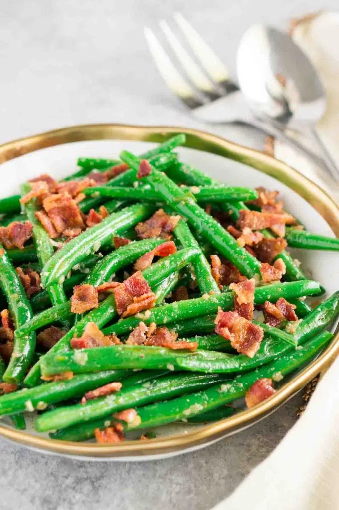 Green beans are a part of most American family’s holiday table (or at least I think they should be). They are also an easy and fuss-free side dish to prepare for a weeknight dinner or a quick vegetable dish to add to your meal plan routine. I have shared earlier with you my tips for making the best green beans recipe but today I am sharing another favorite – garlic green beans with bacon. The addition of bacon provides a comforting depth of flavor and sophistication to this simple side dish.