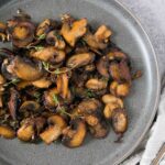 Add sliced mushrooms to the skillet and brown for about 5 minutes on each side, or until browned and caramelized. Add garlic, and saute for 30 seconds, until fragrant. Season with salt, black pepper and thyme.